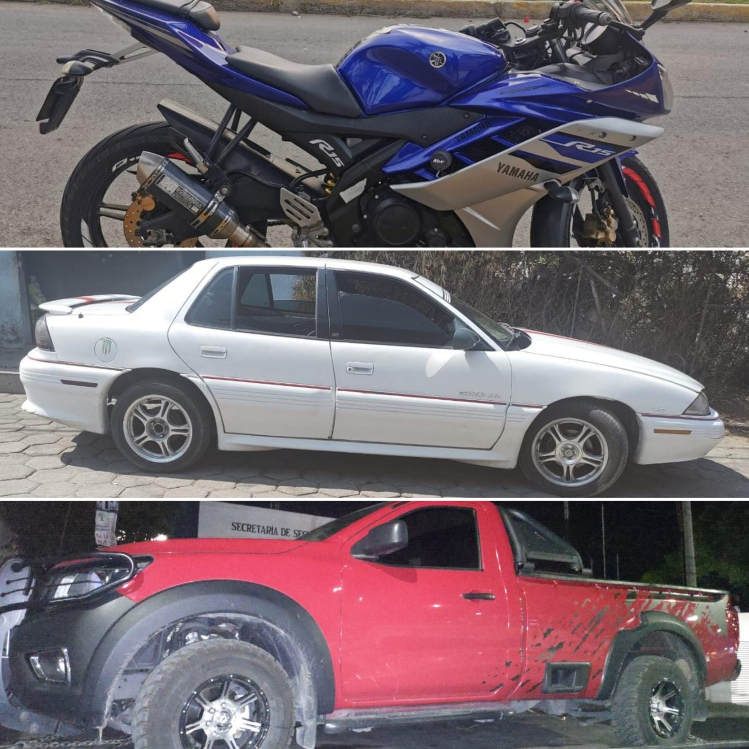 De igual forma se aseguraron las siguientes unidades vehiculares con alteraciones en sus medios de identificación: vehículo Pontiac, modelo Grand Am Gt, con placas D72ARY y una motocicleta Italika, modelo 150, sin placas.