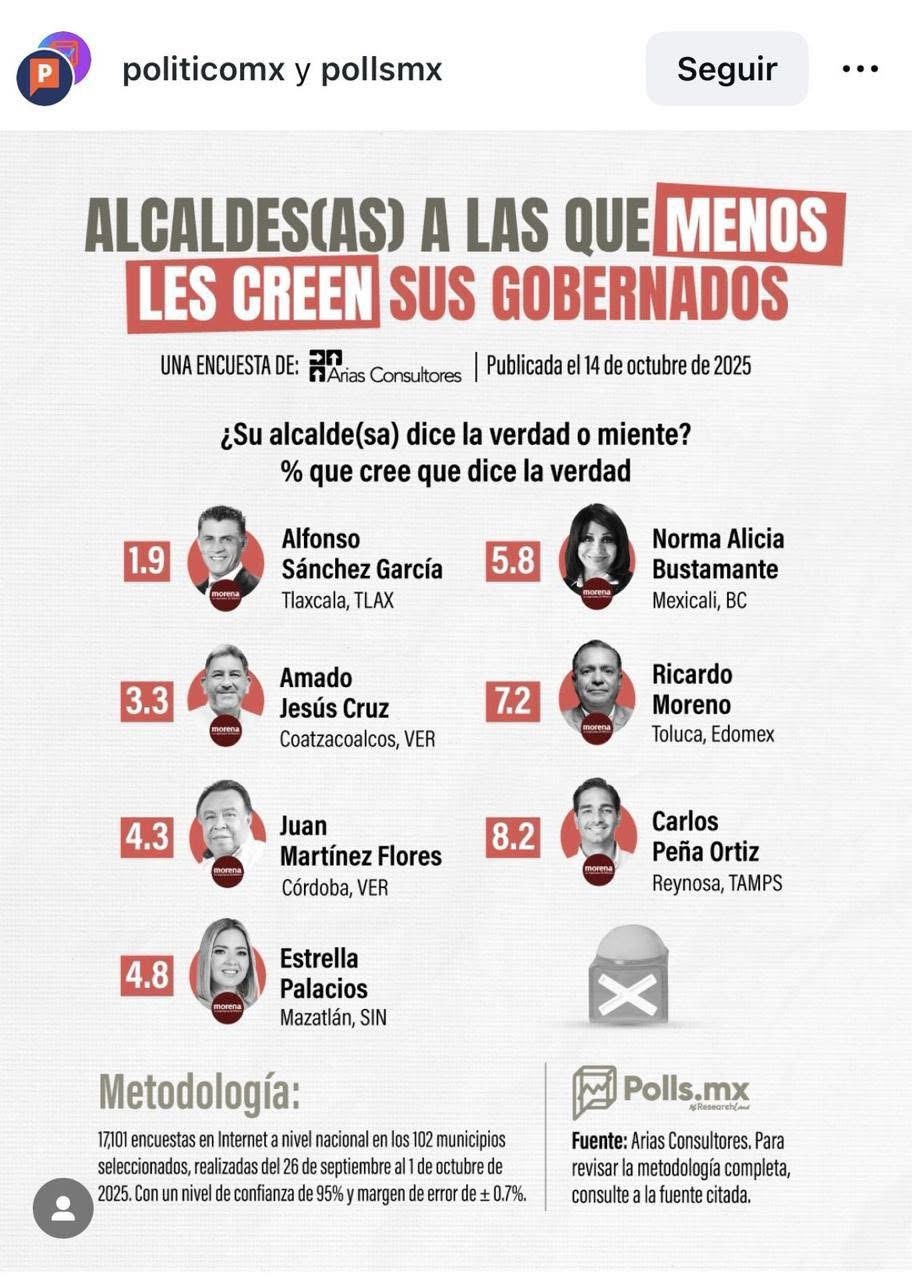 De acuerdo con la más reciente medición de Arias Consultores, el alcalde de Tlaxcala Capital, Alfonso Sánchez García, ocupa el último lugar nacional en credibilidad entre los presidentes municipales evaluados.