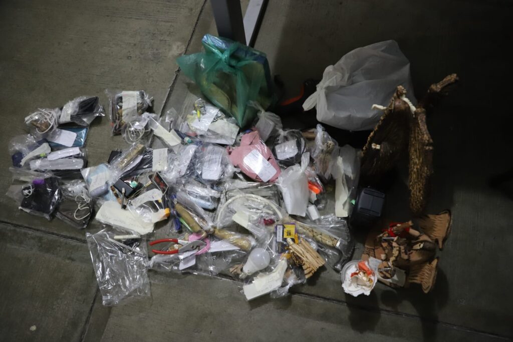 Tras ochos horas, ubicaron más de 70 artículos prohibidos por el reglamento interno, estos correspondieron a tres envases de plástico, dos de 600 mililitros y uno de un litro con una sustancia nociva, 14 puntas de metal hechizas de diferentes tamaños y material, dos básculas pequeñas sin funcionar, tres pipas de cristal y una bolsa transparente con 10 envoltorios de diferentes tamaños y colores con sustancia a determinar.