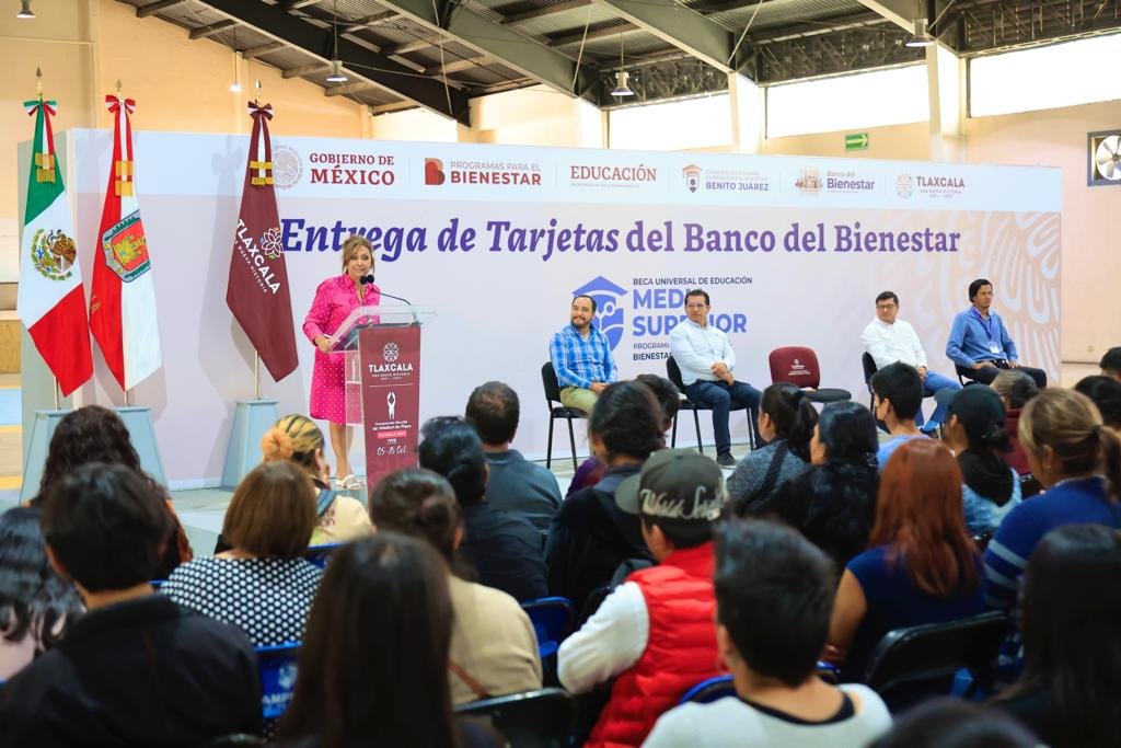 La gobernadora Lorena Cuéllar Cisneros atestiguó la entrega de tarjetas del Banco de Bienestar a más de 800 beneficiarios de la Beca Universal “Benito Juárez” en el municipio de Apizaco.