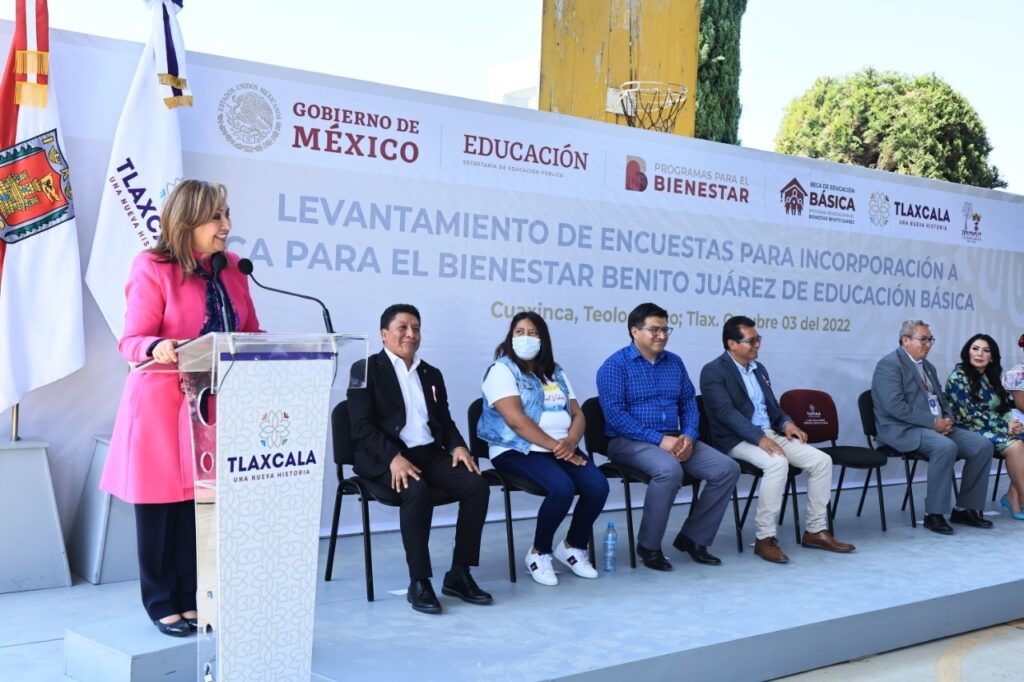 La gobernadora Lorena Cuéllar Cisneros asistió al inicio del levantamiento de la encuesta de Cedula Única (CU) para incorporación a Beca para el Bienestar Benito Juárez de Educación Básica, acto realizado en la Primaria General Guadalupe Victoria de la comunidad de Cuaxinca, municipio de Teolocholco.
