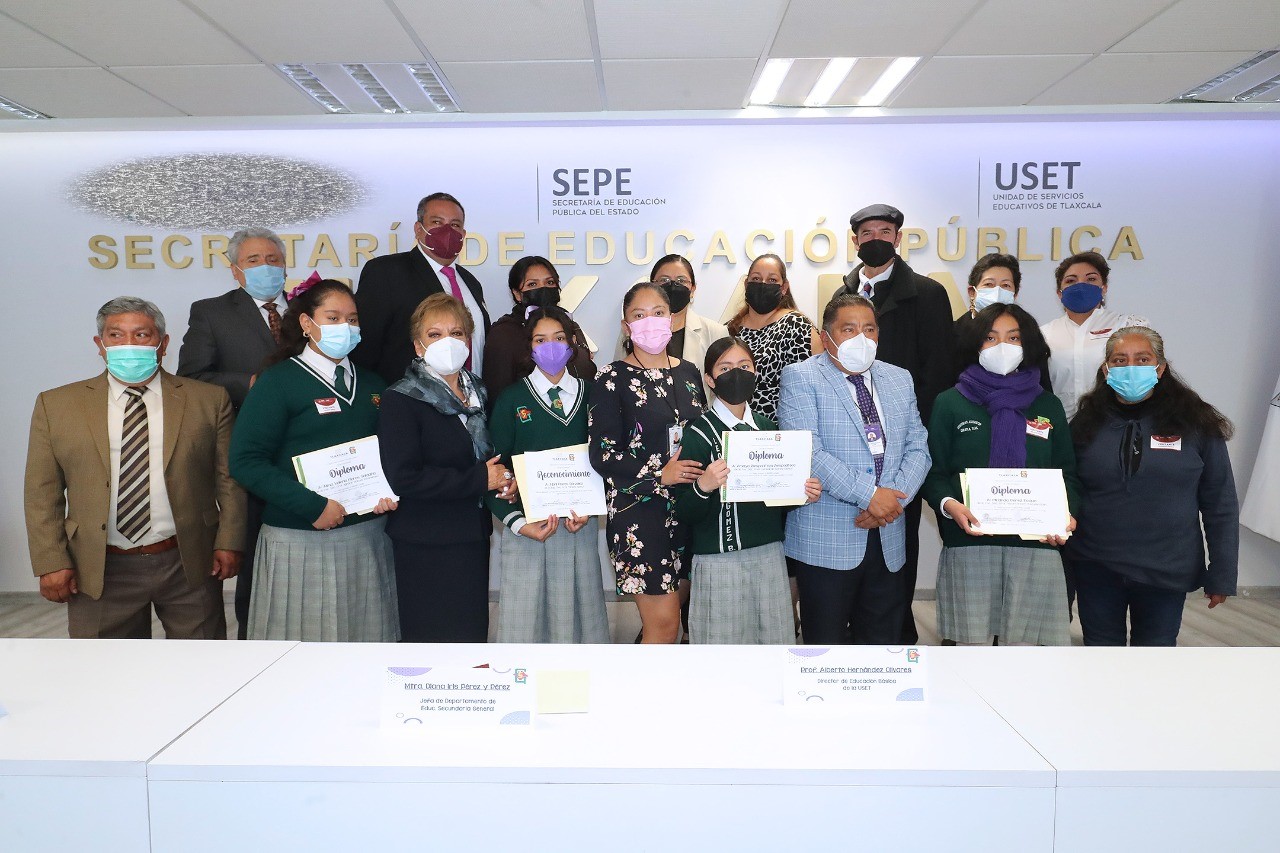 Autoridades de la Unidad de Servicios Educativos de Tlaxcala (USET) premiaron a Amaya Zempoalteca Zempoalteca, Miranda Pérez Roque y Alma Valeria Flores Saldaña, alumnas ganadoras del Concurso Literario “Elaboración de un cuento original en el que la trama empodere a la mujer”, convocado por el Departamento de Secundarias Generales.