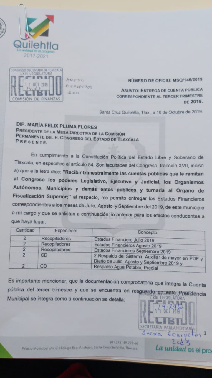 El ayuntamiento de Quilehtla que encabeza el alcalde, Oscar Pérez Rojas, se encuentra dentro de los cinco municipios en entregar la cuenta pública del último trimestre.