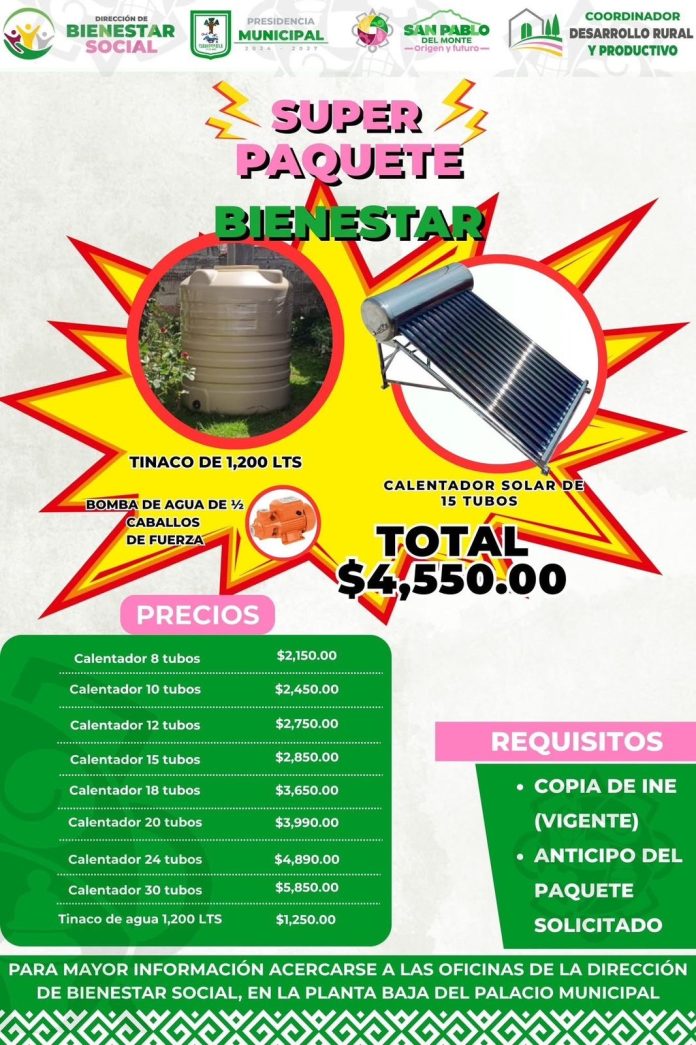 El Ayuntamiento de San Pablo del Monte (SPM), a través de la Dirección de Bienestar Social; y la Coordinación de Desarrollo Rural y Productivo, pone al alcance de la población el Paquete Bienestar, que incluye un tinaco para 1,200 litros de agua, bomba de medio caballo de fuerza y calentador solar de 15 tubos, todo a un precio especial.
