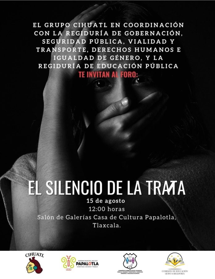 Las regidurías de Gobernación, Seguridad Pública, Vialidad y Transporte, Derechos Humanos e Igualdad de Género y la de Educación Pública del Gobierno Municipal de Papalotla unirán esfuerzos con el grupo Cihuatl, para realizar el foro “El Silencio de la Tr4ta”, programado para el próximo 15 de agosto en el Salón de Galerías del Centro Cultural Papalotla.