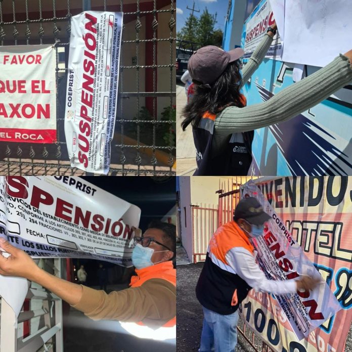 Como medida de seguridad, la Coeprist colocó sellos de suspensión temporal de trabajos y servicios en los accesos principales de cada establecimiento.