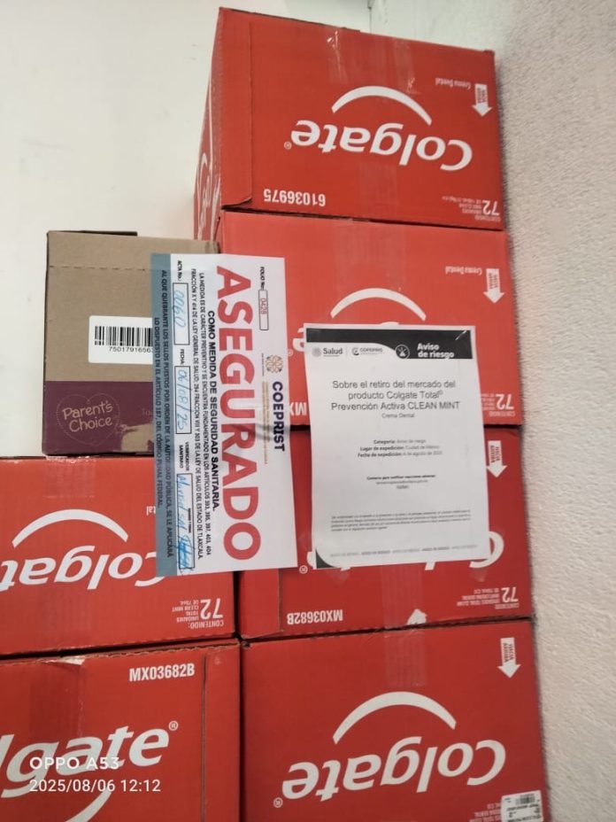 En atención al Aviso de Riesgo emitido por la Comisión Federal para la Protección contra Riesgos Sanitarios (Cofepris), el Gobierno del Estado, a través de la Comisión Estatal para la Protección contra Riesgos Sanitarios de Tlaxcala (Coeprist), desplegó un operativo de vigilancia sanitaria en establecimientos comerciales para asegurar el producto “Colgate Total Prevención Activa Clean Mint”, retirado del mercado por posibles riesgos a la salud.