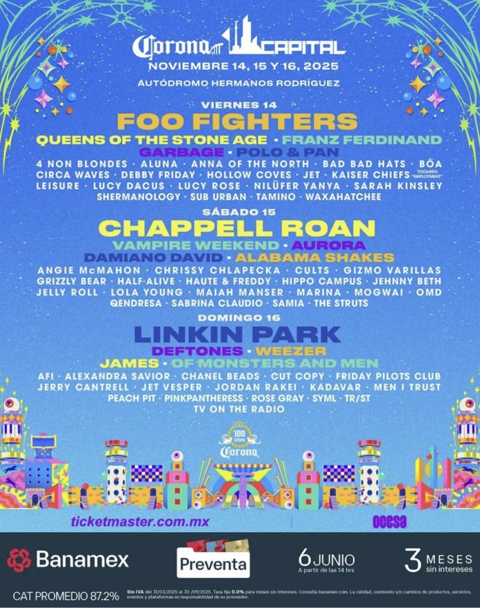 Este martes 3 de junio se dio a conocer el cartel oficial del Corona Capital 2025, que celebrará su 15ª edición los días 14, 15 y 16 de noviembre en el Autódromo Hermanos Rodríguez de la Ciudad de México. El anuncio se realizó a través de una transmisión en vivo en las redes sociales oficiales del festival.