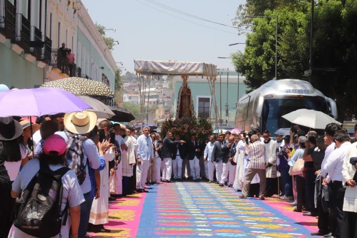 Desde las primeras horas del día, le cantaron “Las Mañanitas” a la virgen de Ocotlán; después, la imagen fue retirada de su altar en la Basílica para iniciar su recorrido por las principales calles del Centro Histórico de Tlaxcala, en un camino adornado con tapetes de aserrín, pétalos de rosa, en el que visitaron más de 40 altares para hacer un rezo en cada una.
