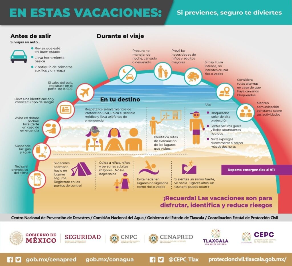 Si sale del país no olvide registrarse en la Secretaría de Relaciones Exteriores (SRE) y atiende la Guía del Viajero, pues será de ayuda en caso de emergencia; además de revisar el pronóstico del tiempo y los avisos meteorológicos que emiten las autoridades en el lugar de su destino.