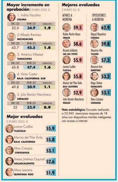 La encuesta, hecha a 53 mil 943 mexicanos mayores de 18 años con dispositivos móviles inteligentes con acceso a internet; cinco de cada 10, aprobaron, en promedio, el desempeño de los gobernadores y jefa de gobierno en enero del 2023.