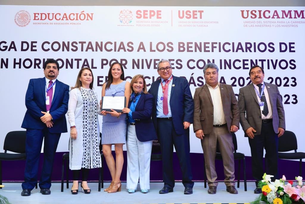 Durante el acto protocolario, la mandataria destacó que Tlaxcala es el único estado del país que aporta recursos económicos para la promoción de docentes, a través de la Unidad del Sistema para la Carrera de las Maestras y Maestros (Usicamm)