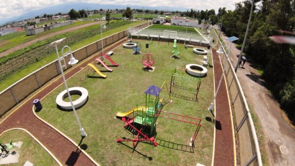 Mientras que en la unidad deportiva se construyeron gradas metálicas, baños y una cancha de fútbol a base de pasto sintético, un muro de escalar, un andador y se instalaron juegos infantiles, gimnasio al aire libre, lámparas solares y un portón principal.