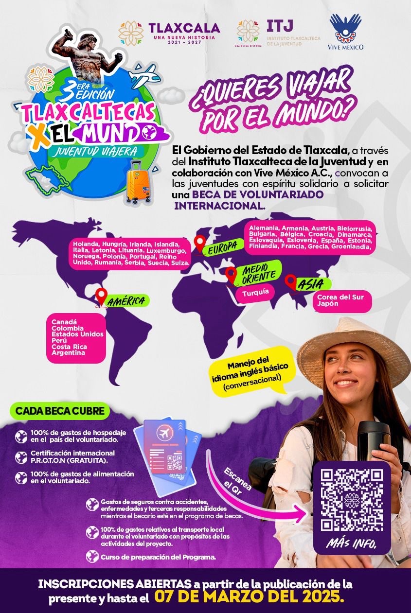 El Instituto Tlaxcalteca de la Juventud (ITJ) extendió la convocatoria de Tlaxcaltecas por el Mundo “Juventud Viajera”, para que más jóvenes conozcan y aprovechen esta oportunidad; y también derivado del interés de mujeres y hombres de 18 a 30 años que han mostrado en este programa, por lo que podrán hacer el registro hasta el próximo 7 de marzo.