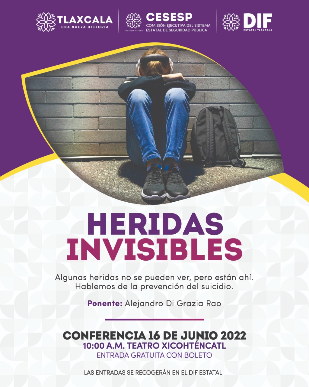 Con el propósito de generar conciencia entre la población del estado respecto a la violencia familiar e identificar señales de alerta en el comportamiento de las y los jóvenes tlaxcaltecas que permitan prevenir el suicidio, la Cesesp impartirá de manera gratuita la conferencia de carácter familiar, el próximo 16 de junio a las 10 de la mañana en el Teatro Xicohténcatl.
