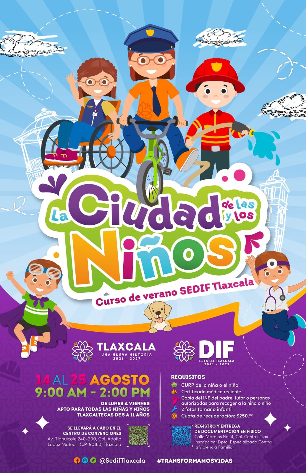 El Sistema Estatal para el Desarrollo Integral de la Familia (Sedif) invita a las y los niños tlaxcaltecas de 5 a 11 años de edad a participar en el Curso de Verano “La Ciudad de las y los Niños”, que se llevará a cabo del 14 al 25 agosto en el Centro de Convenciones en Tlaxcala, de lunes a viernes de 9:00 a 14:00 horas.