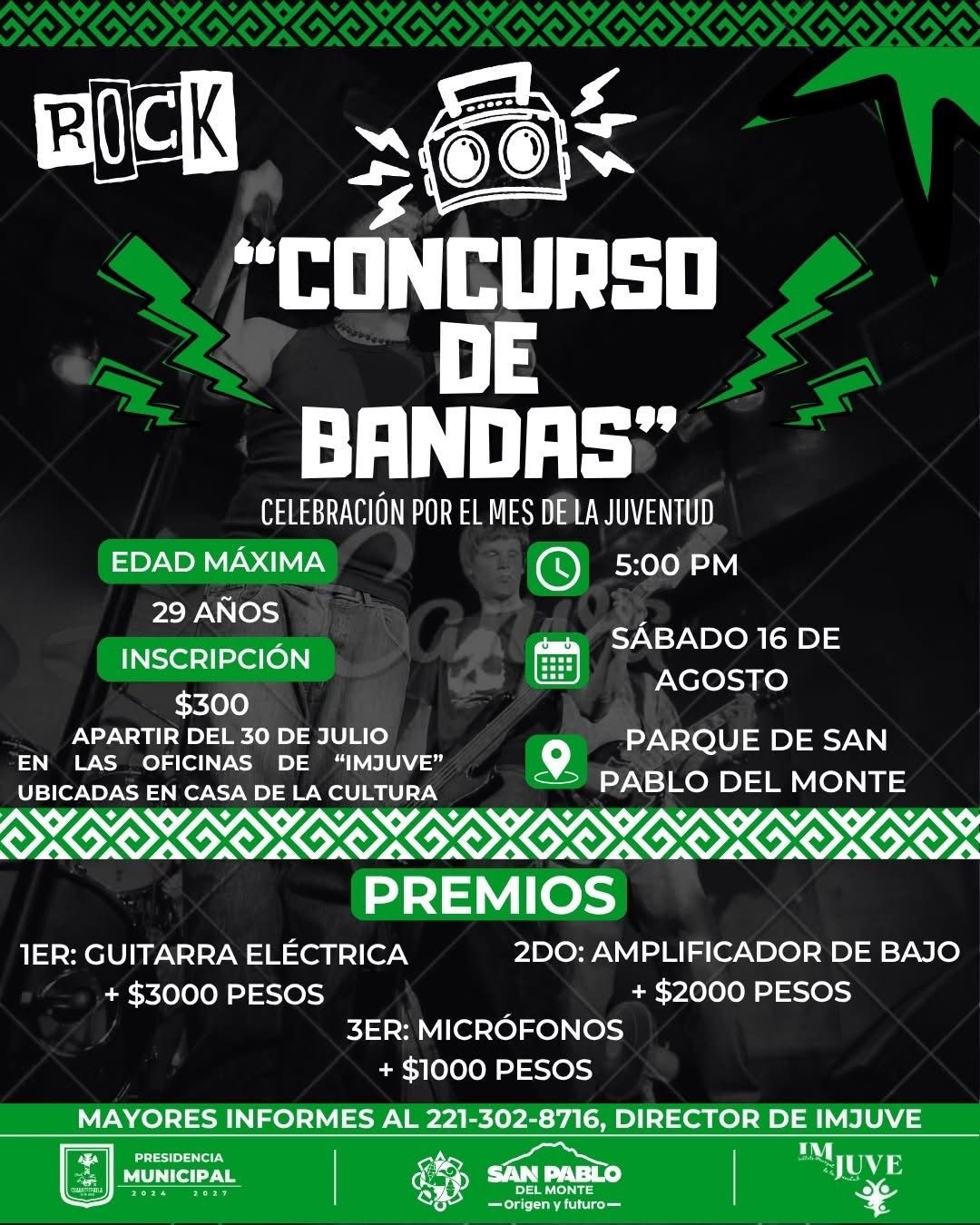 A través del Instituto Municipal de la Juventud (IMJUVE), el Ayuntamiento de San Pablo del Monte invita al Concurso de Bandas de Rock, como parte de las actividades programadas por el mes de la juventud.