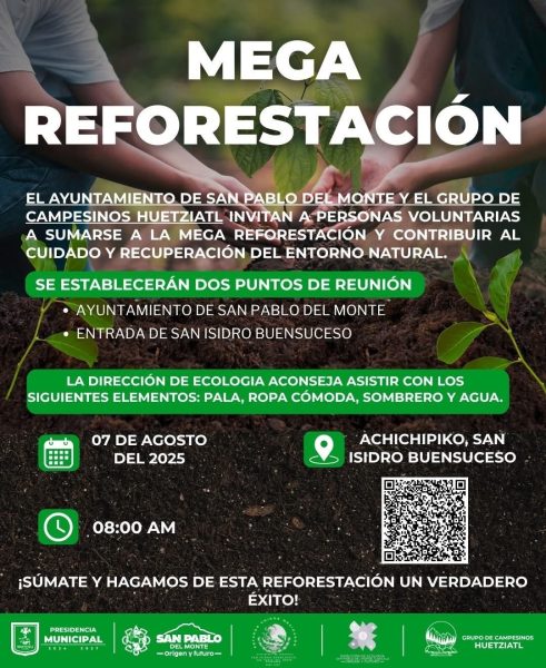 El Ayuntamiento de San Pablo del Monte, a través de la Coordinación de Ecología y el valioso apoyo del grupo de campesinos Huetziatl, invitan a personas voluntarias a sumarse a la Mega Reforestación este 7 de agosto en la zona conocida como Achichipiko, en las faldas de La Malinche.