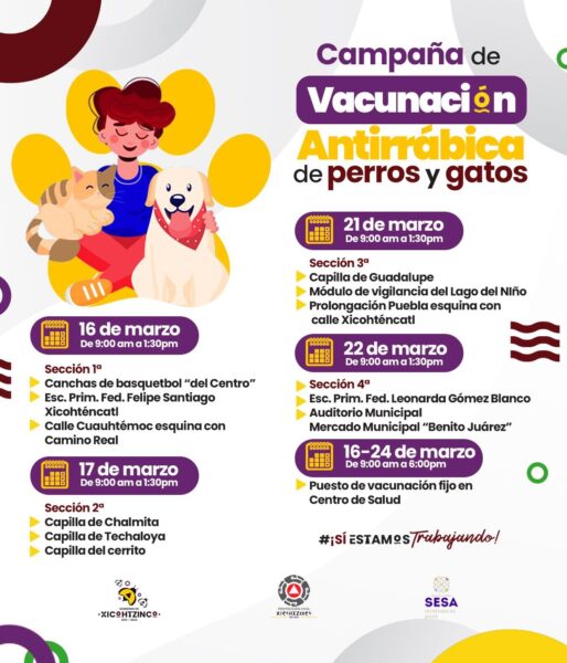 •Como parte de los esfuerzos conjuntos de los tres niveles de gobierno para combatir la rabia canina y felina del 16 al 24 de Marzo las mascotas de los ciudadanos de Xicohtzinco podrán ser parte de la Jornada Nacional de Vacunación Antirrábica.
