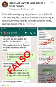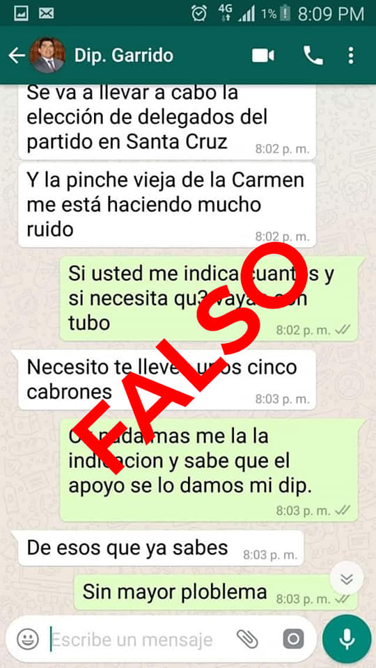 “Estimados amigos y seguidores, por medio de mi cuenta quiero compartir estas capturas que supuestamente son de conversaciones mías, quiénes realmente tienen contacto conmigo saben que yo no utilizo esa foto en WhatsApp y que tampoco me expreso de esa forma, es lamentable el tipo de prácticas que utilizan las personas para difamar y desprestigiar; por mi parte seguiré enfocado y trabajando en mis actividades legislativas”, aclaró en su perfil personal Garrido Cruz.