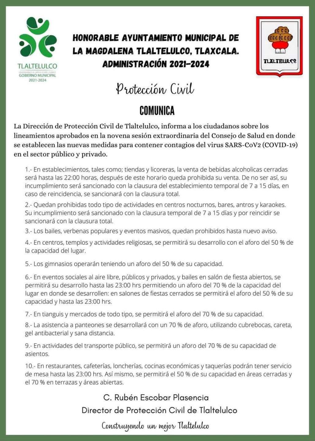 El H. Ayuntamiento de Tlaltelulco informa a los ciudadanos sobre los lineamientos aprobados en la 9na sesión extraordinaria del Consejo de Salud en donde se establecen las nuevas medidas para contener contagios del virus SARS-Cov2 (COVID-19) en el sector público y privado.