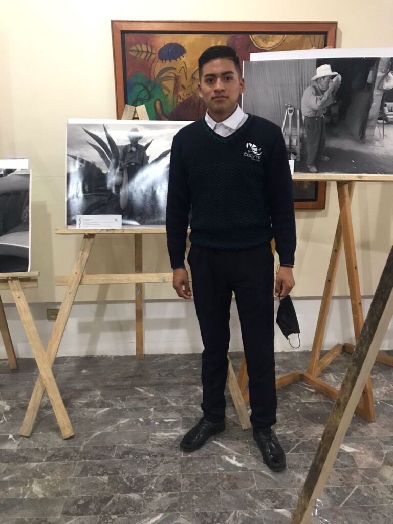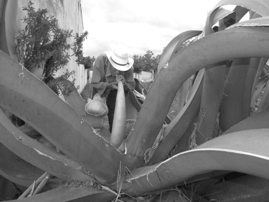 Morales Texis presentó una serie de tres piezas en blanco y negro que muestran a su abuelo realizando el proceso de extracción de aguamiel para la producción de pulque; esta es una de las bebidas ancestrales más representativas del estado, la gastronomía y la cultura.