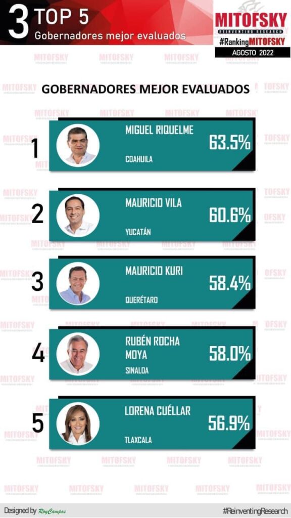 En el ranking general, la encuesta ubica a Cuéllar Cisneros en los primeros cinco lugares de aprobación ciudadana, acompañada de sus homólogos de Coahuila, Yucatán, Quintana Roo y Sinaloa