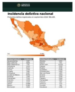 Las estadísticas revelan que desde el mes de mayo y hasta septiembre de este 2022, la entidad tlaxcalteca registró la menor estadística de incidencia delictiva del país, seguido de los estados de Yucatán y Nayarit en el mismo lapso.