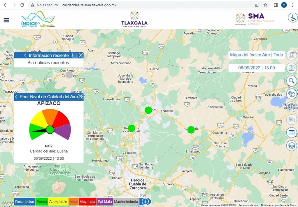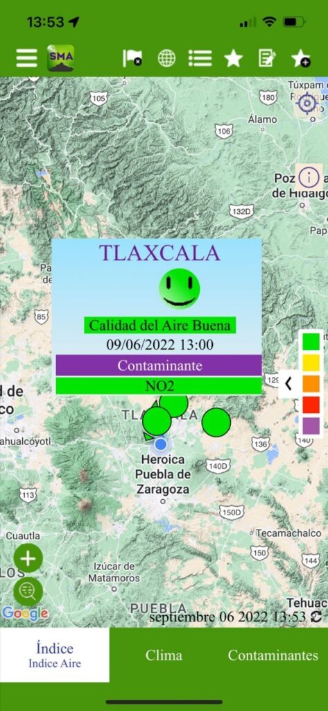 En conmemoración al Día Internacional del Aire Limpio por un Cielo Azul, el 7 de septiembre, la Secretaría de Medio Ambiente (SMA) lanzó la aplicación “Aire Tlaxcala” que facilita a la ciudadanía consultar el índice Aire y Salud, lo cual permite conocer en tiempo real la calidad del aire en las zonas donde existen estaciones de monitoreo atmosférico.