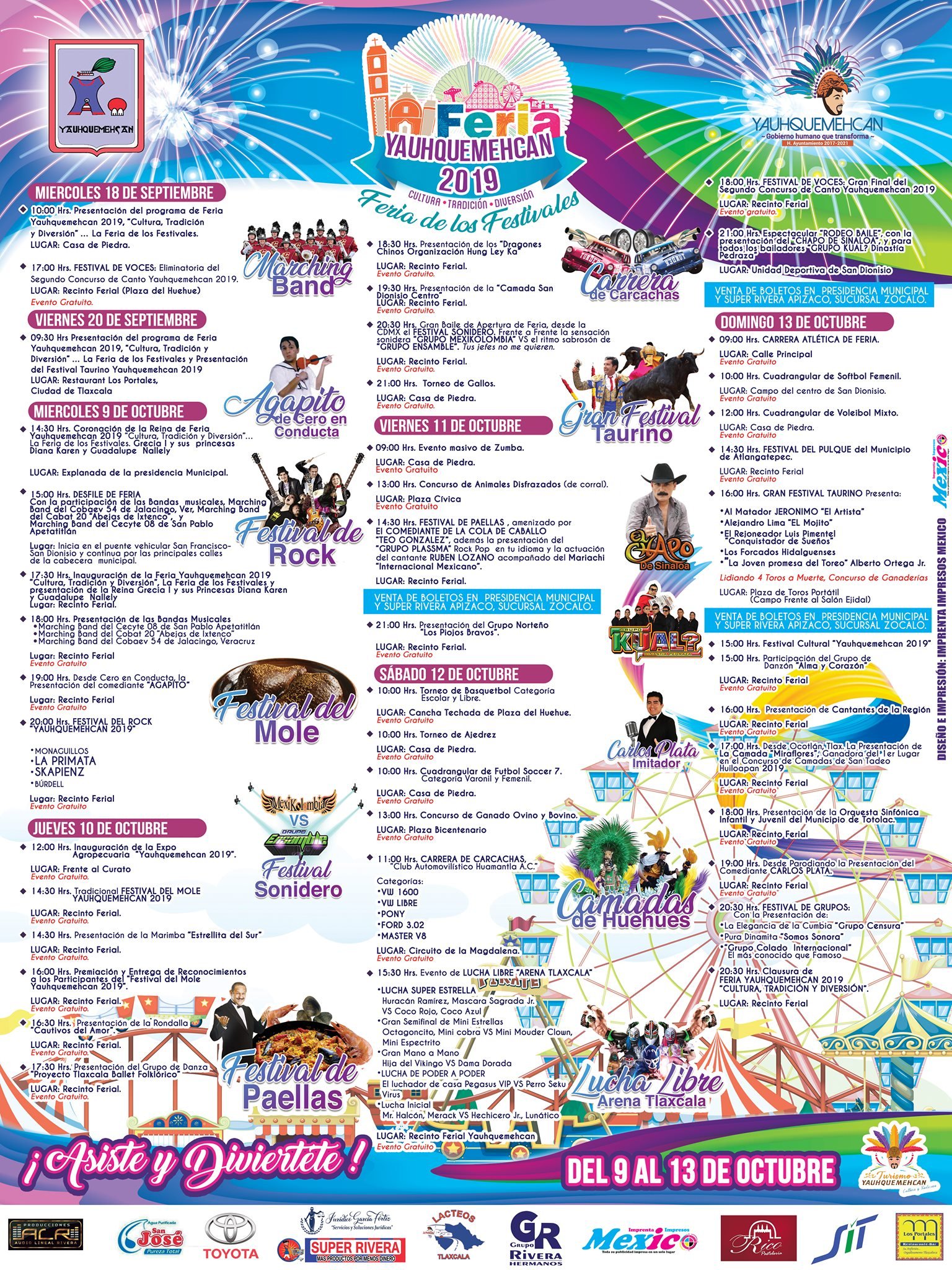 10:00 hrs. Presentación del programa de la Feria Yauhquemehcan 2019, “Cultura, Tradición y Diversión” … La Feria de los Festivales.