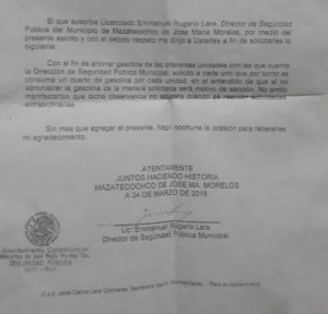 En el municipio de Mazatecochco el Director de Seguridad Pública Emanuel Rugerio Lara, por escrito ordenó a los oficiales de la corporación ahorrar en el consumo de gasolina y prohíbe consumir más de un cuarto de tanque en las patrullas por turno.