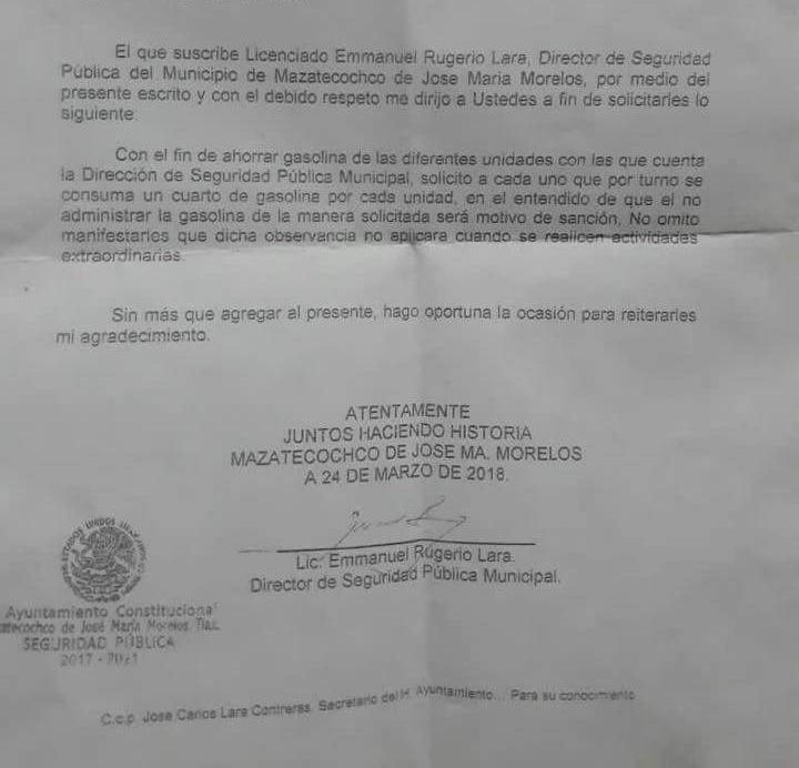 En el municipio de Mazatecochco el Director de Seguridad Pública Emanuel Rugerio Lara, por escrito ordenó a los oficiales de la corporación ahorrar en el consumo de gasolina y prohíbe consumir más de un cuarto de tanque en las patrullas por turno.