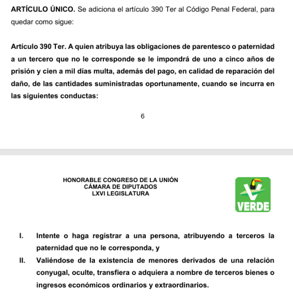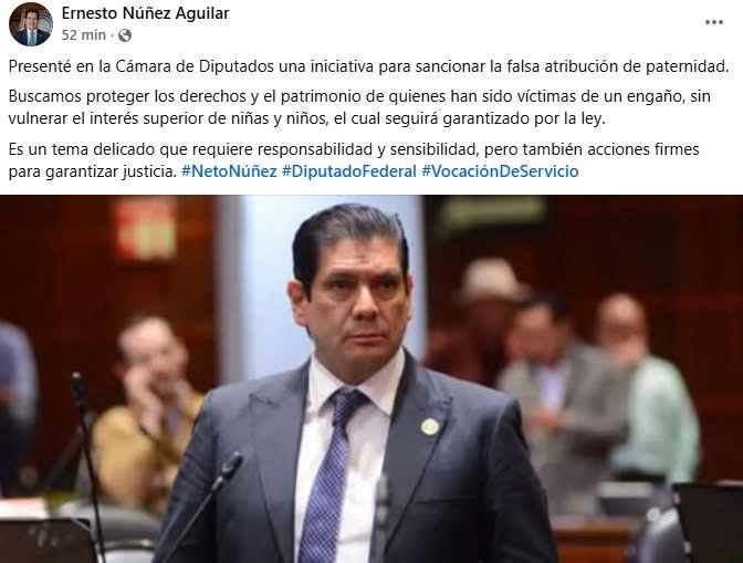 El diputado federal del PVEM, Ernesto Núñez Aguilar, presentó una iniciativa para castigar con cárcel, multas y reparación del daño a mujeres que señalen falsamente a un hombre como padre de un menor, con el objetivo de obtener beneficios económicos o afectivos.
