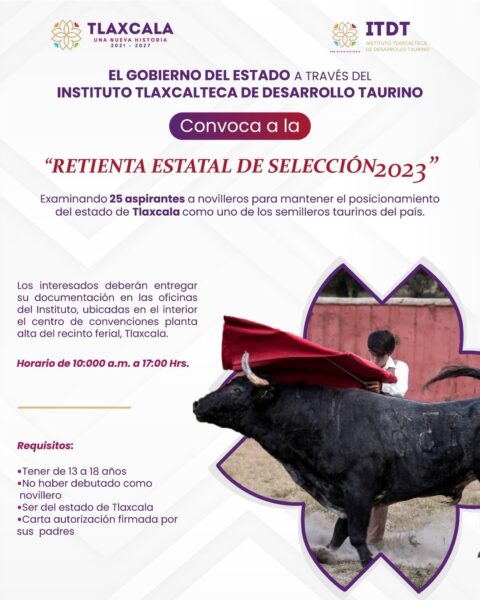Como parte del proyecto “Retienta Estatal de Selección 2023”, el gobierno del estado, a través del Instituto Tlaxcalteca de Desarrollo Taurino (ITDT), realizará una serie de “calas” o pruebas para jóvenes de 13 a 18 años de edad y de esta manera detectar nuevos talentos del toreo.