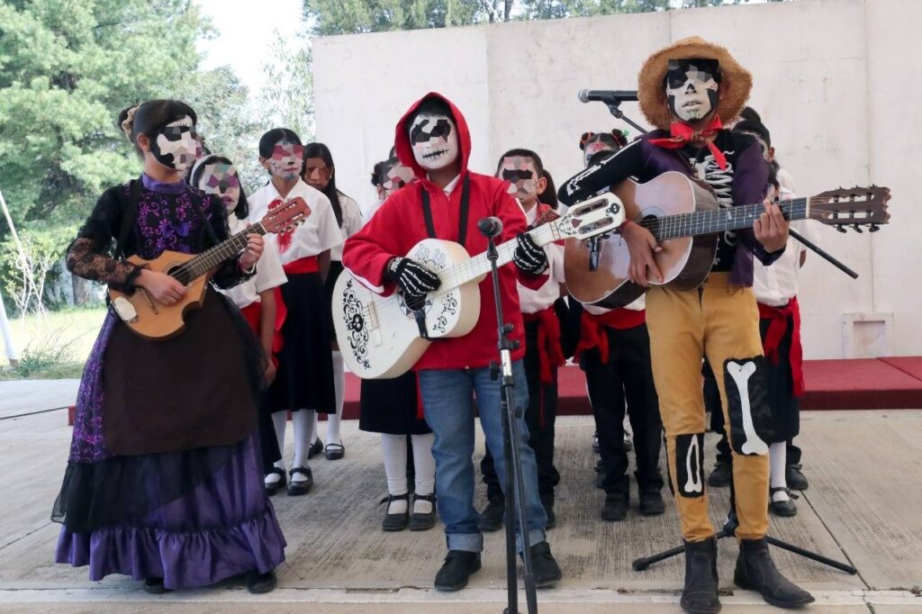 En la explanada “Alonso de Escalona” de oficinas centrales de la Secretaría de Educación Pública del Estado (SEPE) y de la Unidad de Servicios Educativos de Tlaxcala (USET), alumnas y alumnos del internado “General de División José Amarillas”, realizaron una demostración artística alusiva a la temporada del Día de Muertos.