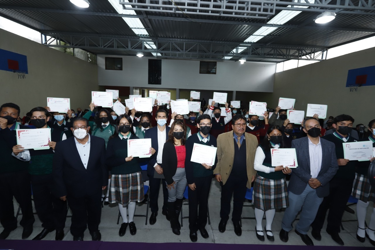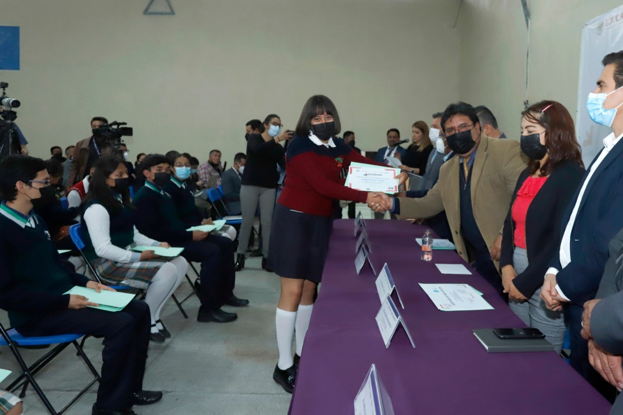 “Ustedes pueden seguir estudiando a distancia, hoy con la tecnología ya no hay impedimentos, pueden continuar superándose y ser personas de bien, que destaquen en la sociedad para beneficio propio, de su familia, de Tlaxcala y de México”, expresó Flores Aguilar.
