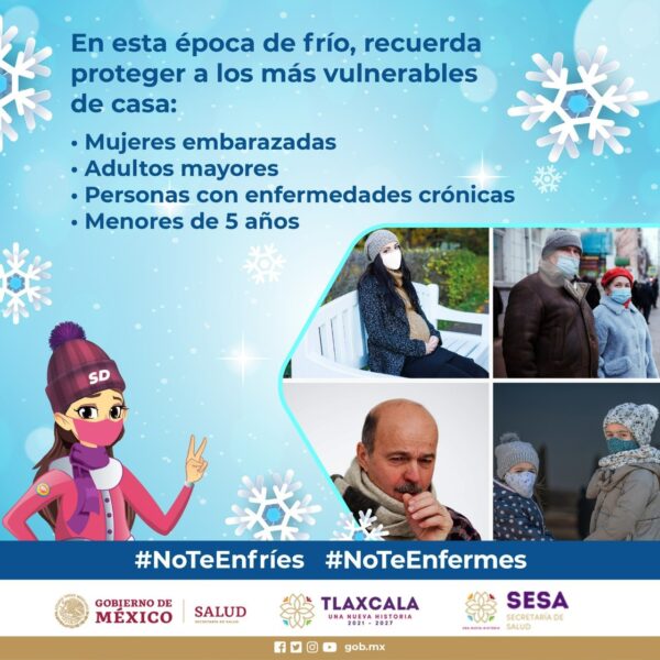 Debido a las bajas temperaturas que se registran en el territorio estatal y nacional, el Sector Salud invitó a la población tlaxcalteca a abrigarse adecuadamente, usar voluntariamente cubrebocas, evitar exponerse a cambios bruscos de temperatura, proteger a niños menores de cinco años y adultos mayores, así como evitar encender anafres dentro de las habitaciones con la finalidad de prevenir enfermedades y complicaciones a la salud.