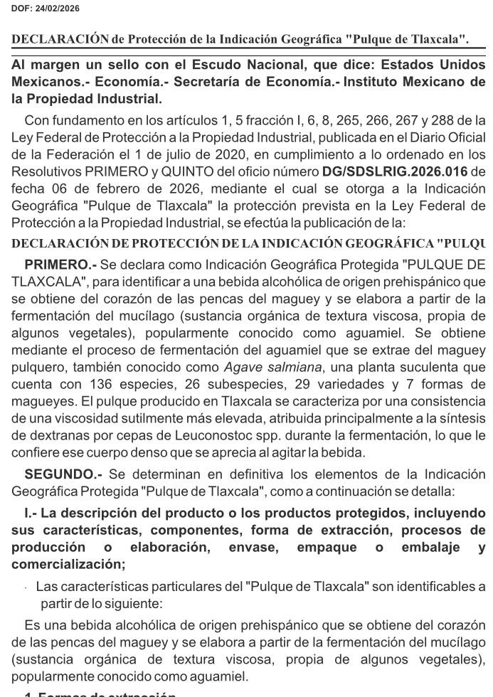 El Instituto Mexicano de la Propiedad Industrial (IMPI) publicó en el Diario Oficial de la Federación la Declaración de Protección de la Indicación Geográfica “Pulque de Tlaxcala”, con lo cual esta bebida tradicional de origen prehispánico gozará de las previsiones establecidas en la Ley Federal de Protección a la Propiedad Industrial.