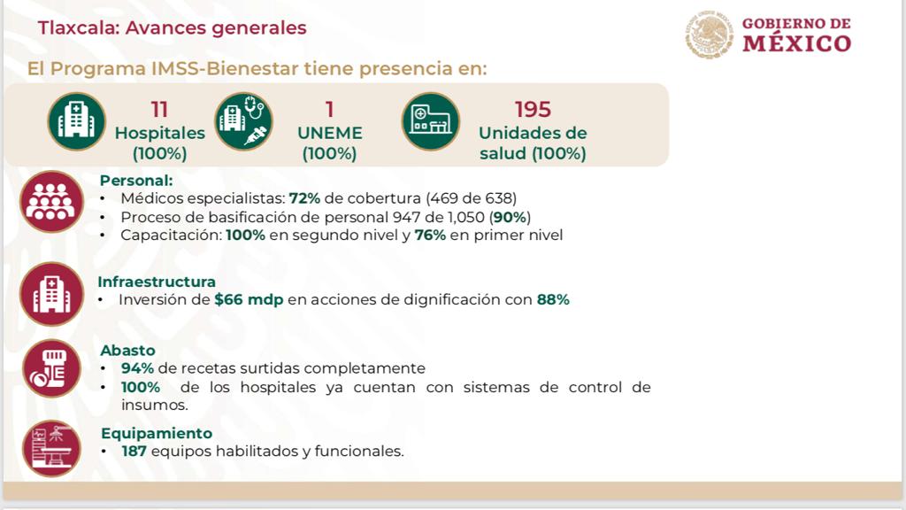 En la entidad tlaxcalteca se tiene presencia del IMSS-Bienestar en el 100 por ciento de los 11 hospitales, una UNEME y 195 unidades de salud o de primer nivel de atención, además de una cobertura del 92 por ciento de médicos especialistas porque se cuentan con 469 de los 638 que se estarán contratando, por lo que aún hay muchas vacantes de especialidades para Tlaxcala.