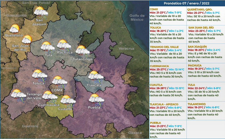 De acuerdo con el reporte del Servicio Meteorológico Nacional (SMN) perteneciente a la Comisión Nacional del Agua (Conagua), la lluvia con intervalos de chubasco fue de 5 a 25 mm, por lo que se prevé una temperatura mínima de -5 a 0 grados Celsius y una máxima de 21 a 23 grados para este viernes.