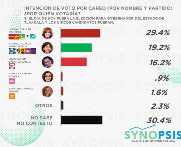 El virtual candidato a la gubernatura por el partido Redes Sociales Progresistas, Juan Carlos Sánchez García SAGA, registra esta semana un crecimiento en las preferencias electorales quedando a una mínima diferencia de alcanzar la segunda posición. Así lo refleja la encuesta Synopsis, análisis de opinión pública, donde en la intención de voto por nombre y partido refleja una tendencia positiva hacia Juan Carlos Sánchez García, colocándolo a solo 3 puntos de el segundo lugar. En el rubro de opinión “buena y muy buena” hacia los virtuales candidatos, el abanderado por las siglas de RSP al gobierno de Tlaxcala mantiene el primer lugar con la suma de positivos.