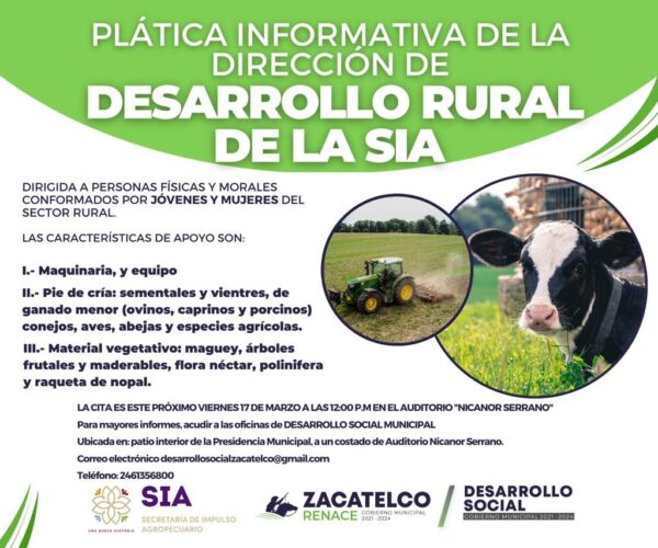 - La Dirección de Desarrollo Rural impartirá plática informativa sobre apoyos con maquinaria y equipo, pie cría y material vegetativo, dirigidos principalmente a jóvenes y mujeres.