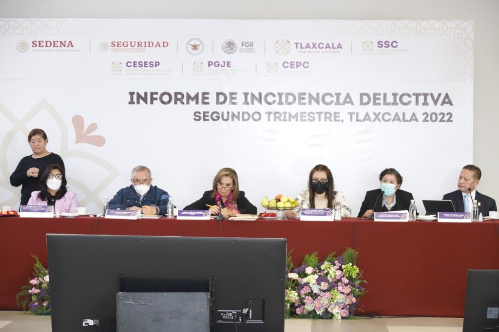 La gobernadora Lorena Cuéllar Cisneros encabezó la presentación del Informe de Incidencia Delictiva correspondiente al segundo trimestre de 2022, acto en el que reconoció el trabajo coordinado y consolidado por parte de los tres órdenes de gobierno para mantener a Tlaxcala como uno de los estados con menor incidencia delictiva del país.