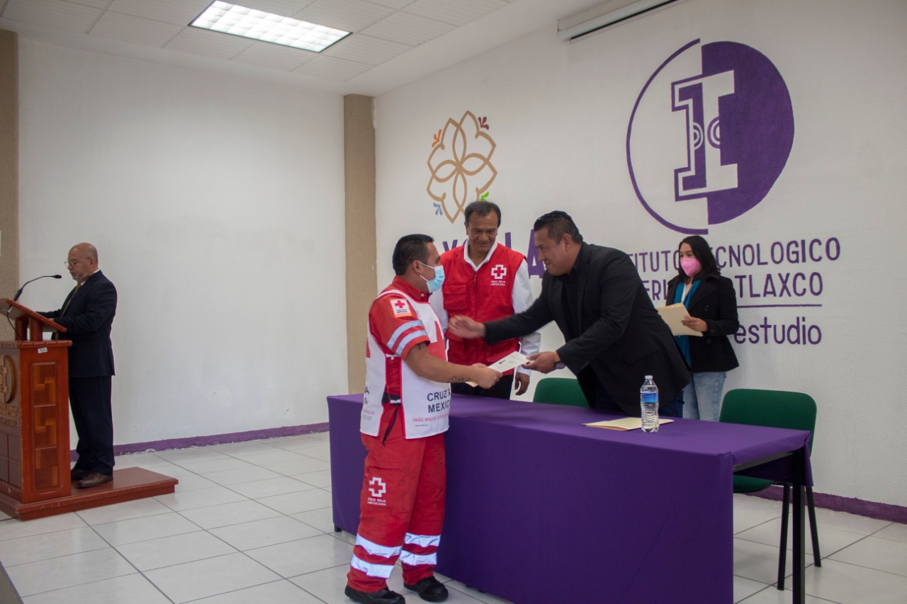 En la sala audiovisual del Instituto, Blas Marvin Mora Olvera, director general del ITST, en compañía de José Luis Fomperosa Sosa, subdirector Académico y José de Jesús Nava Muñoz, en representación de Miguel García Méndez Salazar, delegado estatal de Cruz Roja en Tlaxcala, realizaron la entrega de los reconocimientos.
