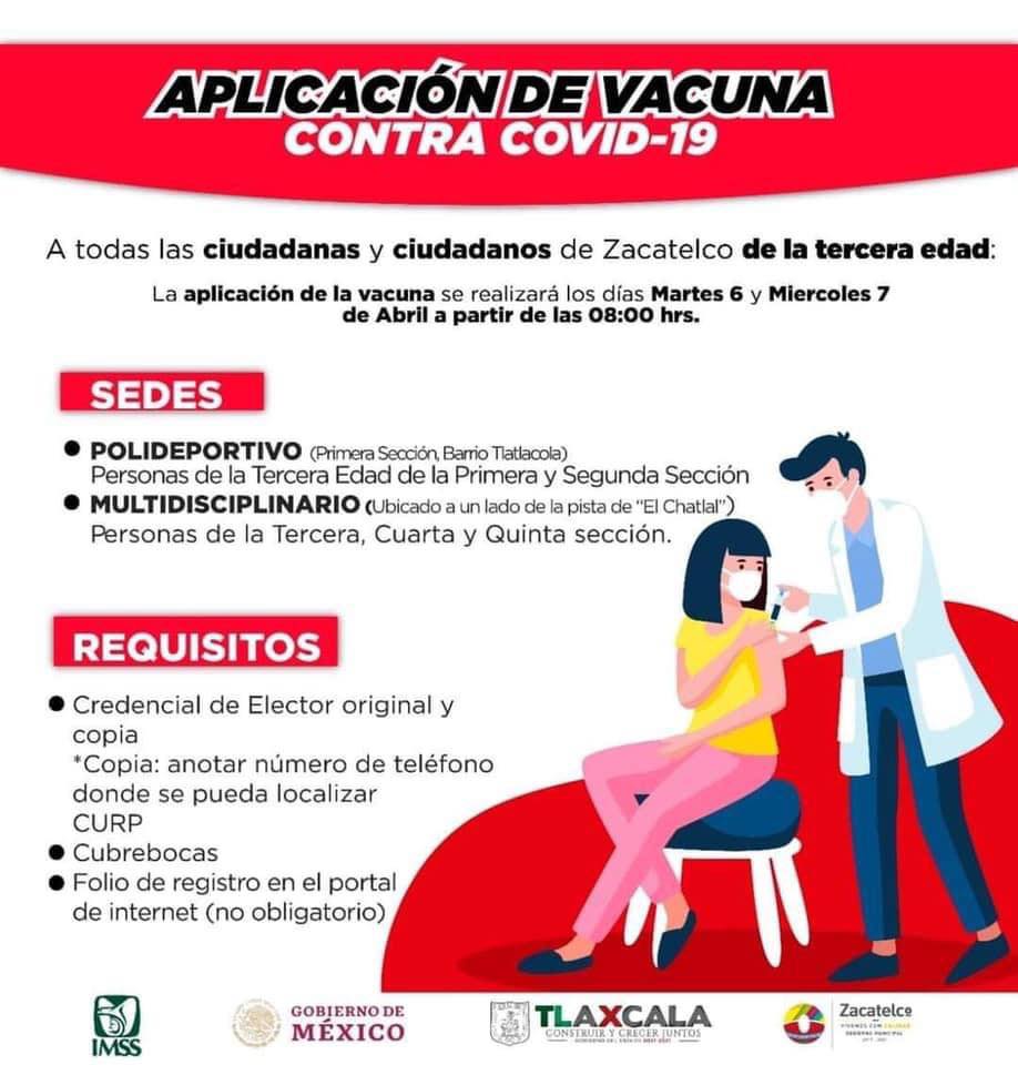 La Secretaría del Bienestar en colaboración con el Gobierno Municipal de Zacatelco, informó que el próximo 6 y 7 de abril iniciará la jornada de vacunación contra el virus SARS-CoV-2 que produce la enfermedad del Covid-19.